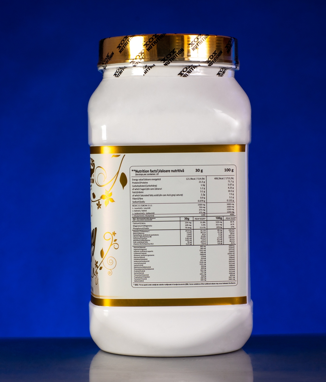 Concentrat proteic din zer ultra filtrat , imbunatatit cu un aport suplimentar de BCAA SI GLUTAMINA acesta contine toti aminoacizi esentiali de care corpul nostru are nevoie, ei repara elementele constitutive esentiale ale muschilor. Proteina din zer este bogata in BCAA (aminoacizi cu lanturi ramificate) si un continut de calciu in portie de 33%.