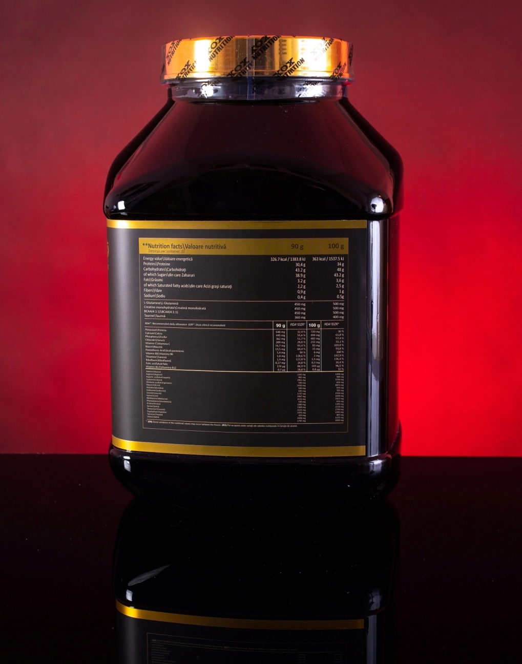 Ingrediente: concentrat proteic ultrafiltrat din zer, dextroză monohidrată, lapte praf degresat, maltodextrină, cacao(pentru variantele de ciocolata si cafea), premix de vitamine şi minerale (citrat trisodic, clorură de sodiu, clorură de potasiu, citrat tricalcic, vitamina C, trimagneziu citrat, niacina, acid pantotenic, vitamina B6, tiamină, vitamina B12, acid folic), L-glutamină, BCAA mix (L-leucină, L-valină, L-isoleucină), creatină monohidrata, agent de îngroşare: gumă xantan (E 415), taurină, arome(vanilie,ciocolata,caimac), îndulcitori: sucraloza(E 955), acesulfam de potasiu (E 950).